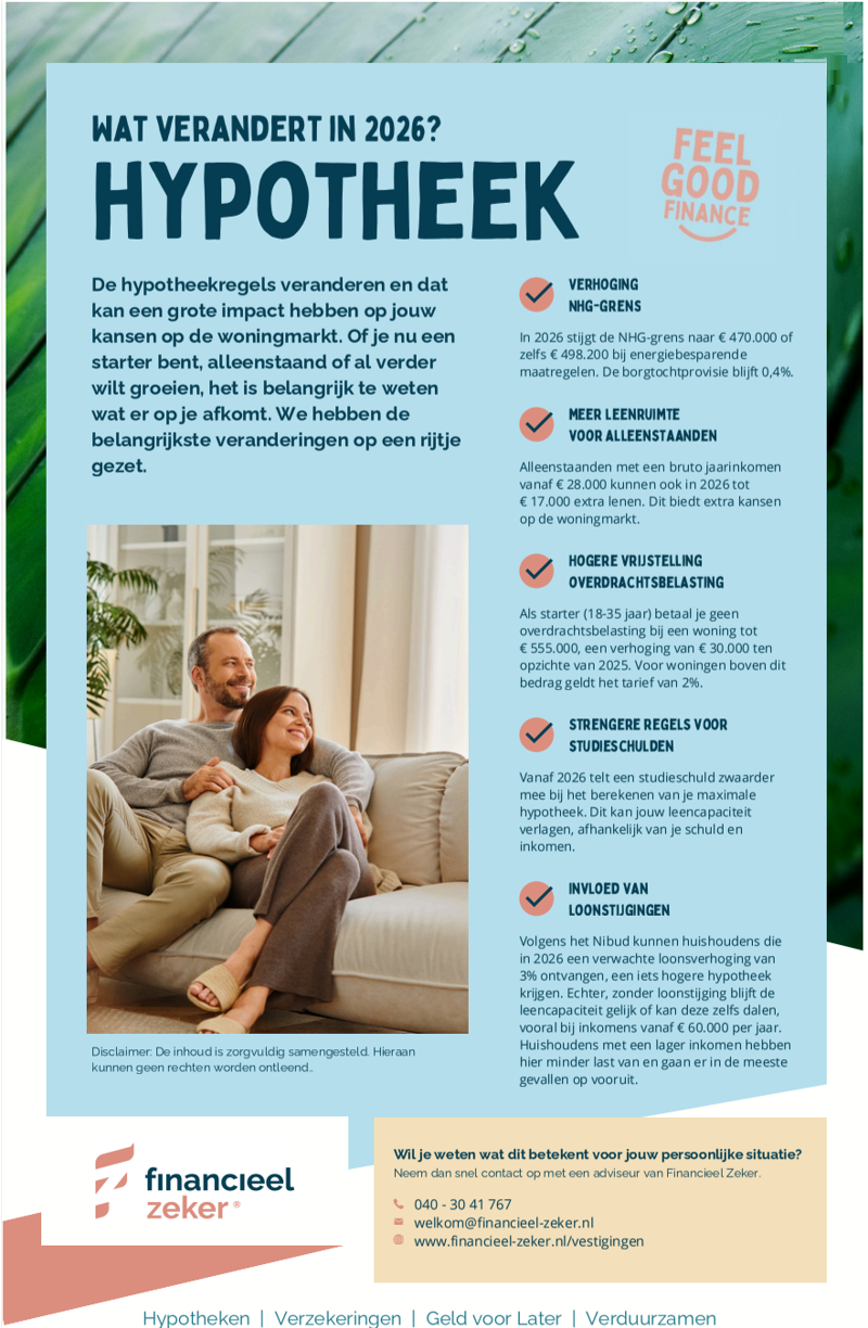 Bij Hypotheek Zeker | Financieel Zeker vergelijken we meer dan 40 aanbieders op prijs en voorwaarden. Zo vinden we samen de aanbieder die het beste bij u past. Dat is Feel Good Finance. meer dan 40 banken en verzekeraars